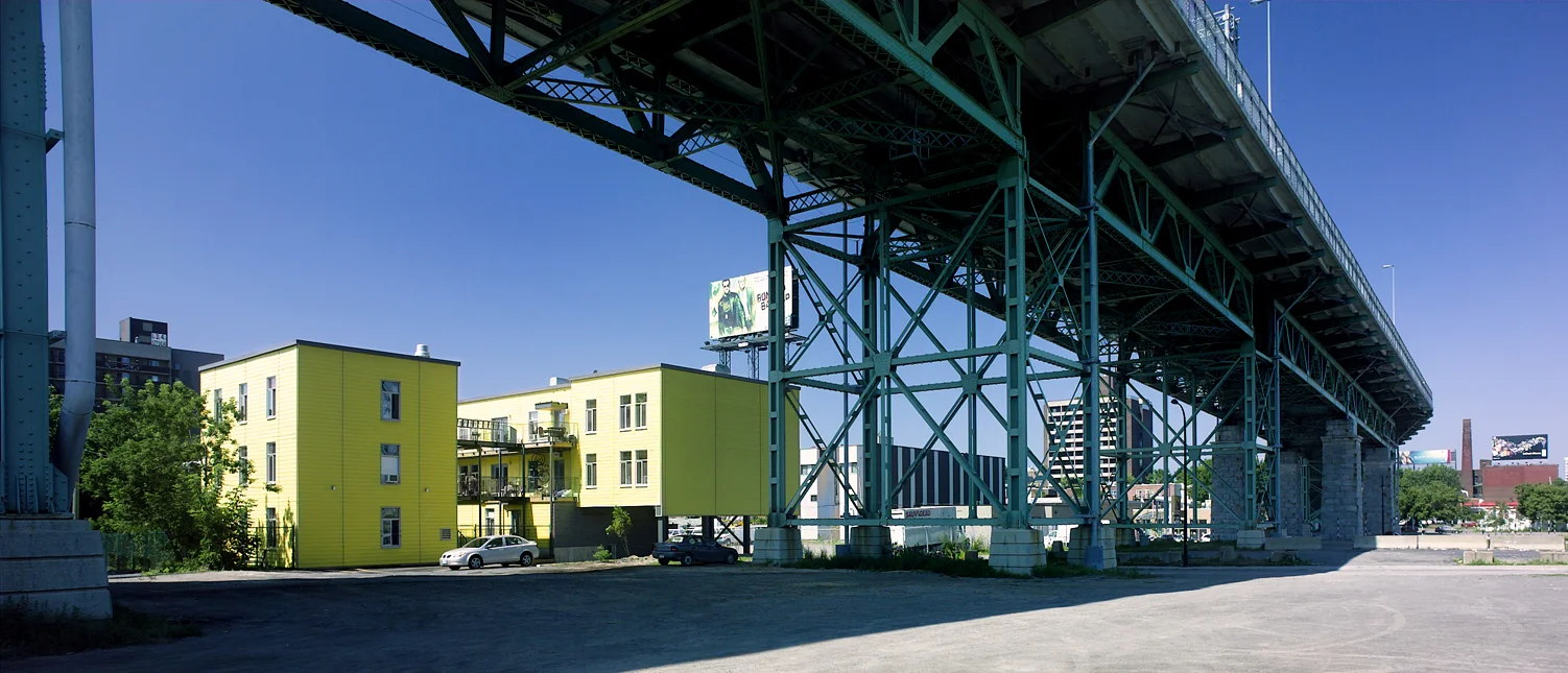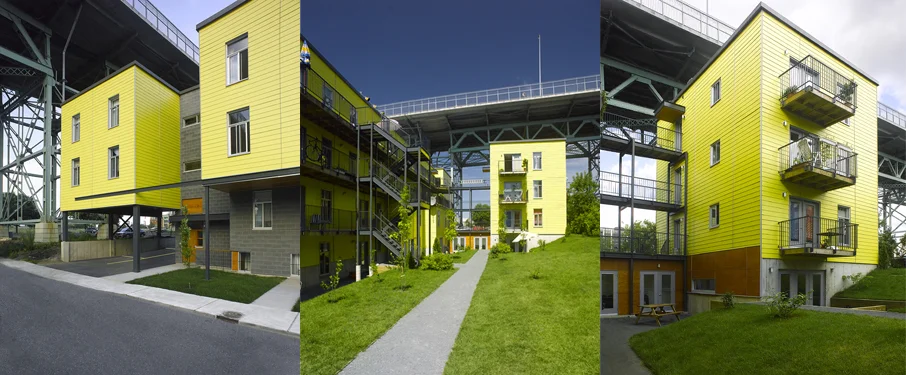 En 2004, les membres de la coopérative d'habitation Au Pied du Courant ont entrepris la transformation d'un terrain vague, sujet à des problématiques liées à l’itinérance, en un lieu d’habitation pour loger de familles. L'immeuble de 17 logements, situé à l’ombre de la structure du pont Jacques-Cartier, nécessitait la mise en place d’une identité forte pour redynamiser le quartier.
