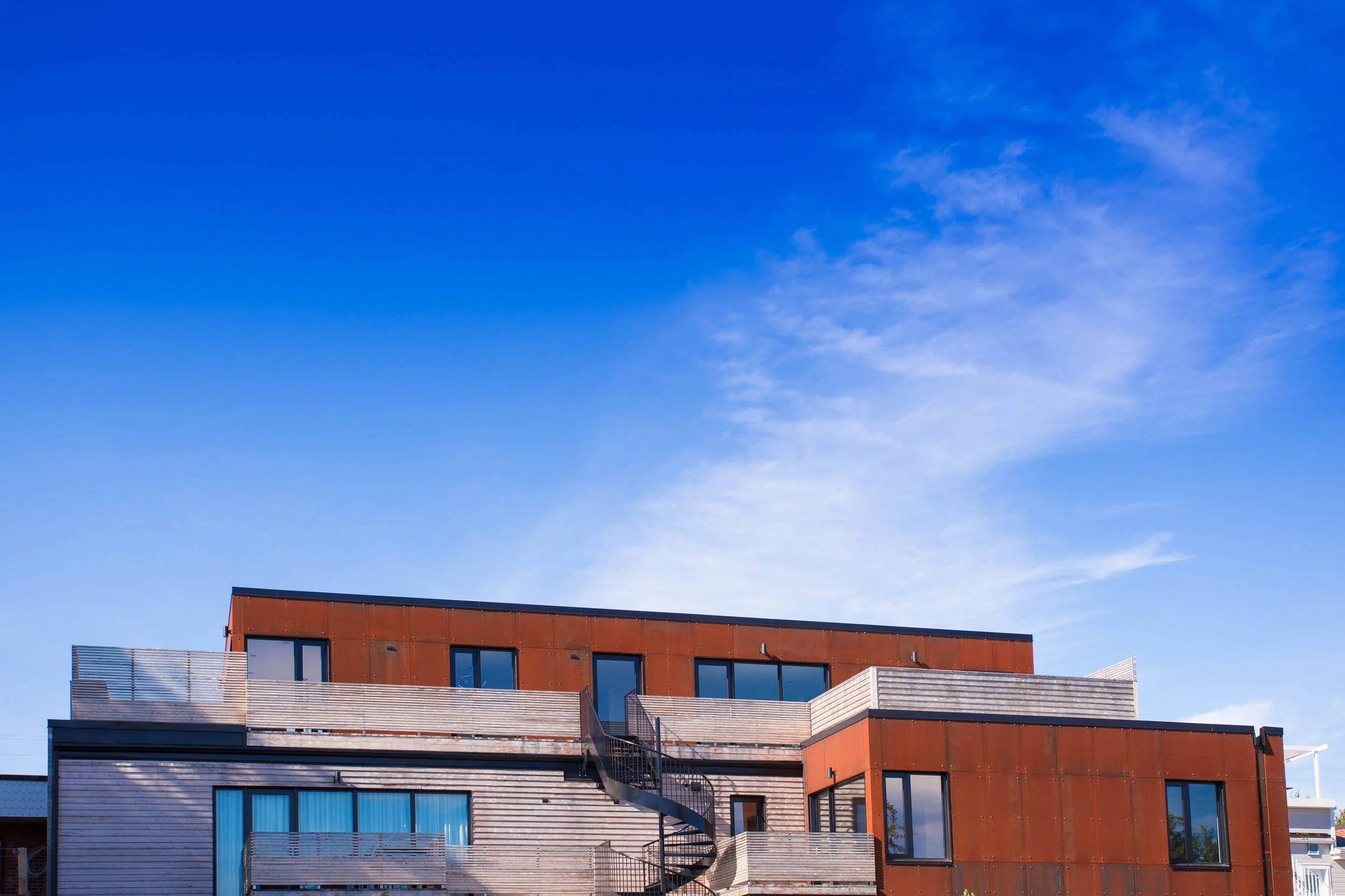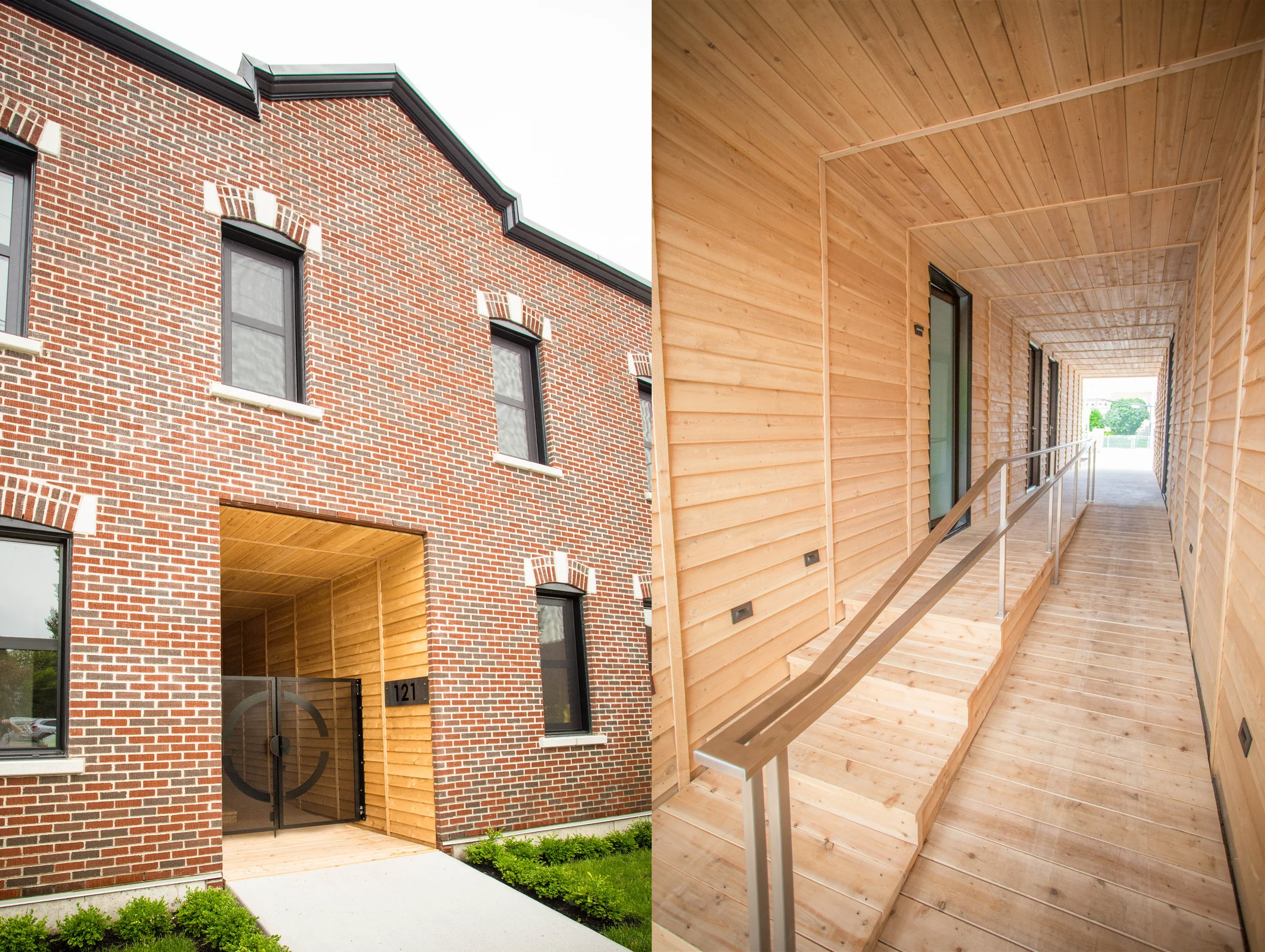 Pour la façade principale à caractère historique, une reconstitution à partir de photos d’archives a permis de restaurer les composantes d’origines; l’emplacement des ouvertures d’origine, les hauteurs et dimensions, la corniche et le revêtement de brique. Comme intervention contemporaine, la porte principale de l’ancienne épicerie a été remplacée par une porte-cochère, traitée avec un revêtement sobre en bois. Les nouveaux corps de bâtiment ont été composés avec de l’acier autopatiné à corrosion superficielle forcée et du cèdre au naturel. La couleur orangée de la rouille et le gris du cèdre s’unissent en harmonie avec la brique rouge prédominante sur la rue.